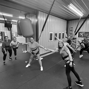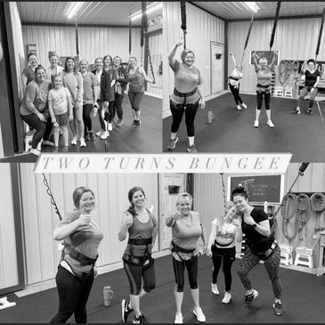 Bungee Fitness involves cardio and strength training. It is a full body workout while attached to a harness and bungee cord. This is a low-impact workout while simultaneously high energy and fun!
